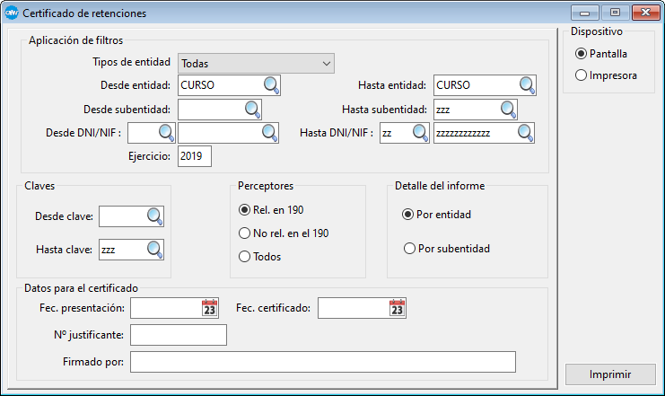 Permite obtener según el modelo de Hacienda el certificado de haberes percibidos y retenciones practicadas según las claves se deseen (personal por cuenta ajena, profesionales, dividendos, arrendamientos, etc.).