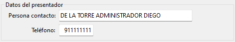 En esta sección se introducen los datos de la persona de contacto ante la AEAT. El nombre dispone de 40 caracteres y debe escribirse en el siguiente orden: primer apellido, espacio, segundo apellido, espacio, nombre. El teléfono ha de tener 9 caracteres y sólo puede incluir números.