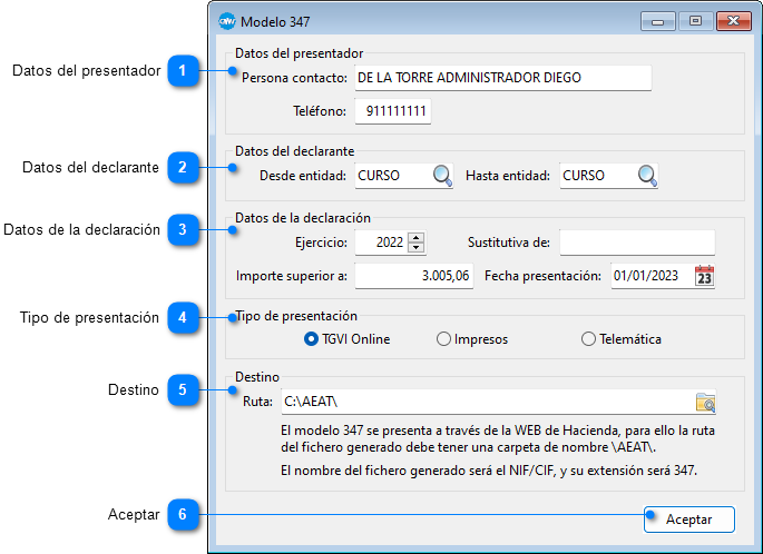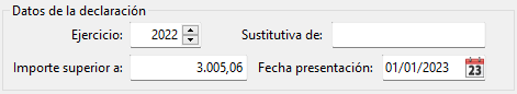 En esta sección se configura la declaración indicando el ejercicio, la fecha de presentación y el importe que deben superar las operaciones de un tercero para que sea incluido.
