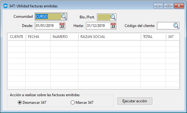 Esta utilidad permite marcar o desmarcar facturas emitidas para que sean procesadas para la declaración informativa del modelo 347 de Hacienda.