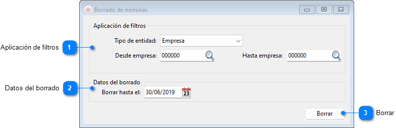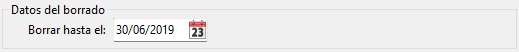 Se ha de indicar la fecha hasta la que se borraran las nóminas. Esta fecha no puede ser superior a la del mes anterior de 5 años atrás. |
