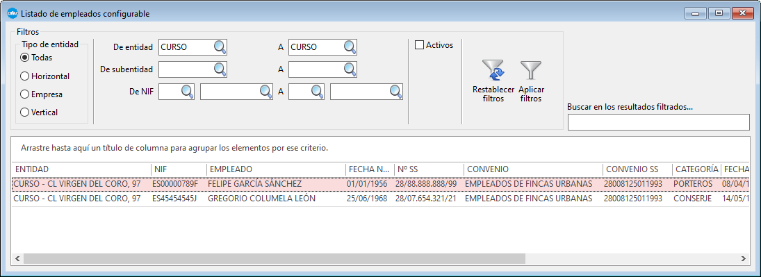 El listado podrá filtrarse para un rango de entidades, subentidades y empleados. Para actualizar el listado en base a los valores introducidos es necesario Aplicar filtros. Para limpiar los campos y refrescar el listado con los datos de la entidad activa se puede utilizar Restablecer filtros.