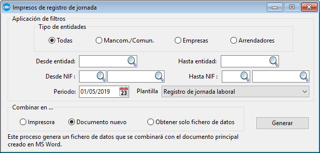 El proceso utiliza una plantilla de MS Word para combinar los datos generados por CMW y obtener el documento final. Esta combinación se puede dirigir directamente a impresora o a un documento nuevo. Si quiere realizar una combinación con una plantilla personalizada que no ha sido añadida a CMW o usarlos para otro uso puede seleccionar “Obtener solo fichero de datos”, esta opción mostrará los datos en el bloc de notas del sistema operativo y podrá guardarlos en el archivo que seleccione.