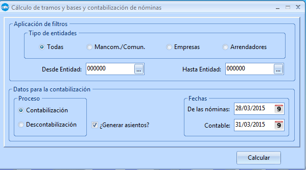 Indique la fecha de las nóminas que se procesaran para obtener los tramos de situación de cada una de ellas. En caso de generar asientos indique la fecha para calcular el asiento.