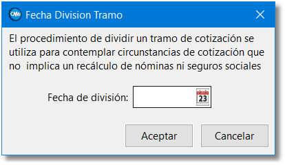 * Dividir tramo seleccionado: Se solicitará una fecha que ha de encontrarse dentro de las fechas del tramo seleccionado.