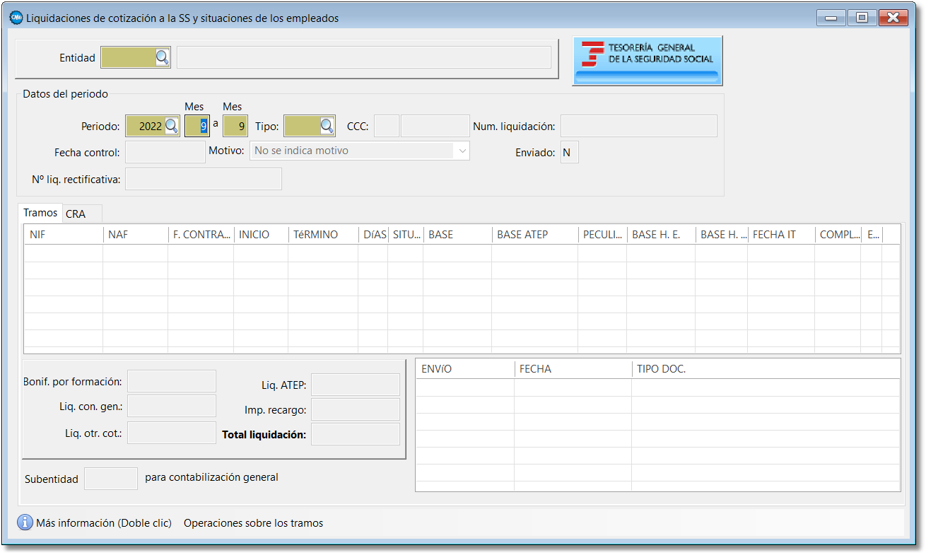 En esta pantalla se muestra la información que se envía a la TGSS de las bases de cotización de los empleados relativa a periodos de liquidación concretos e información de los conceptos retribuidos abonados (CRA) referidos al mismo periodo.