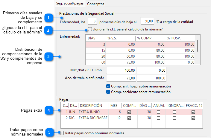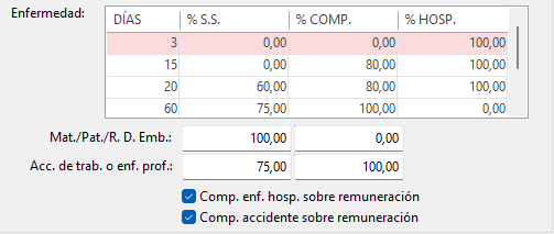 Según sea la baja por enfermedad, maternidad, paternidad o accidente de trabajo, la Seguridad Social compensa a la empresa por pagos al empleado, en unos porcentajes según unos rangos de días. Estos porcentajes se pueden mejorar para el empleado con complementos de empresa o incluso si hay una hospitalización en el caso de una baja por enfermedad.