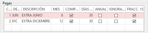 Estas son las pagas extra que indica el convenio. Se pueden configurar hasta 9 pagas extra por convenio. •Mes: Es el mes en el que se ha de calcular la paga. •Completa: La paga es completa sin partes. •Días de paga: Número de días que corresponden por periodo de cómputo. •Anual: Indicamos si la paga es anual o semestral. •Ignorar la I.L.T.: para el cálculo de las pagas: Se calculará la paga como si no hubieran bajas. •Fracción 15 días: Según el inicio y fin del contrato estos se tratarán como mes completo si en ese mes se superan los 15 días trabajados. |