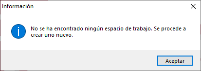 Al arrancar por primera vez la aplicación no hay ningún espacio de trabajo, por lo que nos aparece un mensaje que nos indica que no se ha encontrado ningún espacio de trabajo y se procede a crear uno nuevo. Debemos hacer clic en el botón "Aceptar" para que aparezca el asistente que nos ayuda a crear nuevos espacios de trabajo.