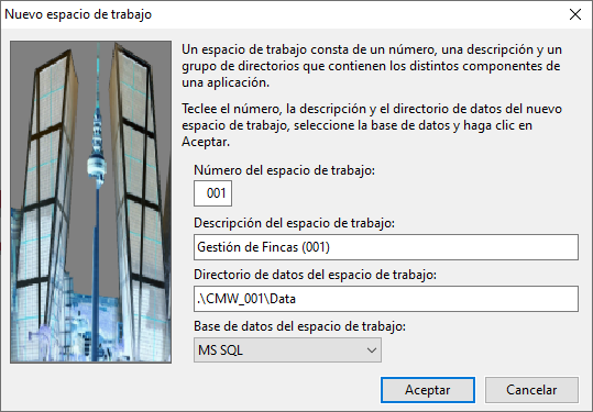 Para crear un nuevo espacio de trabajo teclearemos el número, generalmente el uno, y en ese momento el ordenador nos propone el nombre y el directorio donde se van a guardar los datos de ese espacio de trabajo, si no hay ninguna consideración en contra se aconseja utilizar los datos propuestos por el asistente.