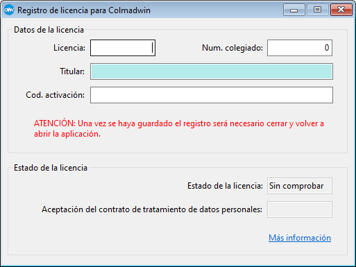 Entrar en el menú <Ayuda> <Registro de CMW> y rellenar los datos de la pantalla con los datos de la licencia entregada por el Colegio de Administradores.