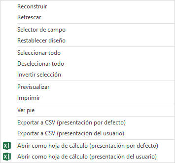 •Abrir como hoja de cálculo (presentación del usuario): Crea un archivo CSV (texto separado por comas) con todo el contenido del Reportcontrol y lo abre como una hoja de cálculo. La exportación de las columnas se hace teniendo en cuenta la presentación actual del Reportcontrol, es decir, es una imagen fiel de lo que se está visualizando actualmente.