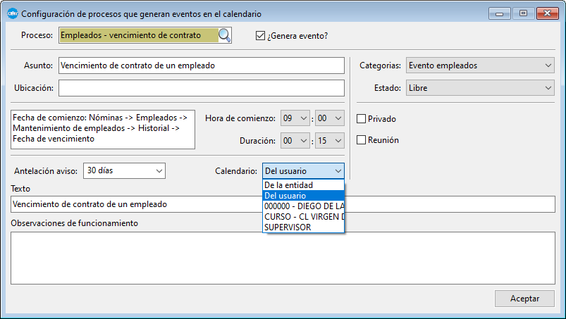 Otro aspecto a destacar es el del campo Calendario, en él aparecerán todos los calendarios que haya en CMW, de esta forma podremos asignar a un calendario concreto el evento, o, si lo preferimos, asignarlo al calendario del usuario que genere el proceso (Del usuario) o al calendario de la entidad activa en ese momento (De la entidad). Ver imagen al comienzo de este punto.