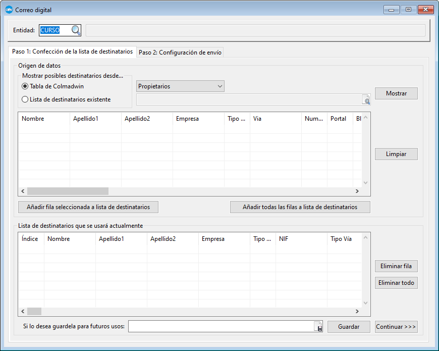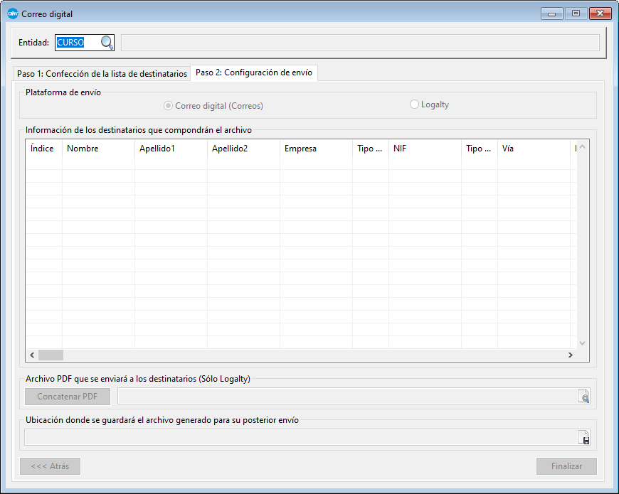En la primera pestaña, Paso 1: Confección de la lista de destinatarios, tendremos que seleccionar los destinatarios a los que se les remitirá la información apropiada, este paso es global a cualquier plataforma de envío que se quiera utilizar (actualmente Correos o Logalty).