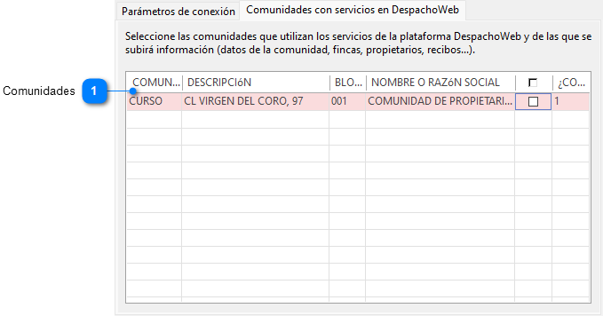 La segunda pestaña de la pantalla presenta la lista de comunidades del programa y permite indicar cuales de ellas utilizan DespachoWeb.