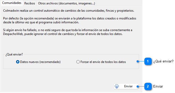 Si algún envío ha fallado, o no está seguro de que toda la información se suba correctamente a DespachoWeb, puede ignorar el control de cambios seleccionando la opción Forzar el envío de todos los datos. |