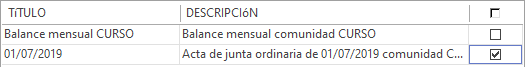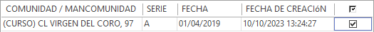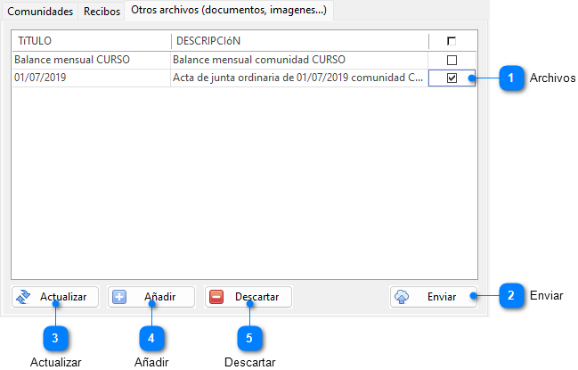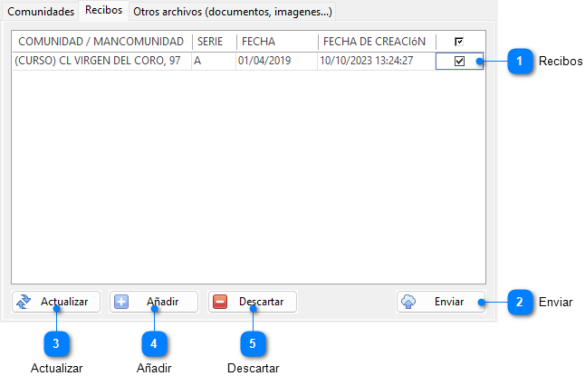 Los archivos de datos de recibos listos para ser enviados se presentan en una rejilla. Cada vez que el programa genera recibos se crearán nuevos archivos, lo que da lugar a nuevas líneas en la rejilla. Por ejemplo, al realizar el cálculo de recibos de una comunidad, se creará un archivo con los recibos de dicha comunidad listos para ser enviados a DespachoWeb. |