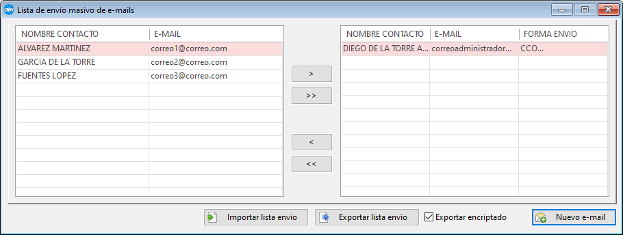 En la rejilla de la derecha aparecerán todas las direcciones de correo electrónico a las que se enviará el e-mail (a partir de aquí se referirá a esta parte como "lista de envío").