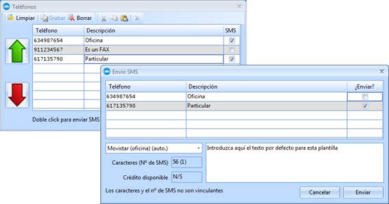Desde el diálogo de teléfonos múltiples, y haciendo doble clic sobre uno de los teléfonos que admita envío de SMS, accederá al diálogo de envío de los mismos.