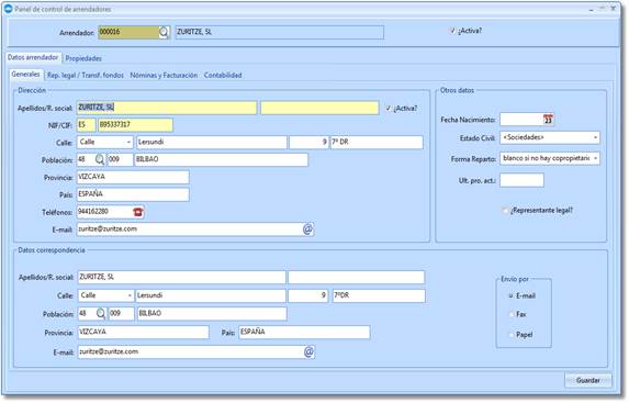 A través de esta ventana se introducen todos los datos relacionados con el arrendador (propietario) y sus correspondientes bienes inmuebles.