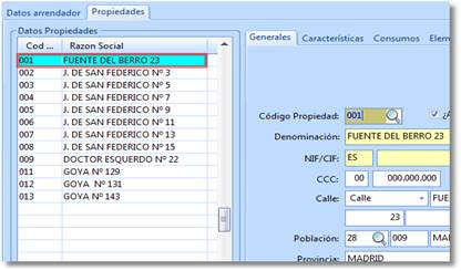 •Generales: En esta pestaña se incluyen los datos de la propiedad, calle, población, provincia.